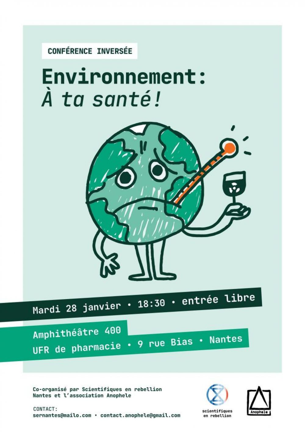 Le groupe local « Scientifiques en Rebellion » de Nantes vous invite à une conférence inversée qui a pour titre « Environnement : à ta santé !» le mardi 28 janvier 2025 à 18h30 dans l’amphithéâtre 404, UFR de pharmacie (9 rue Bias, Nantes).