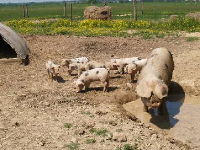 – production de porcs en plein air de race « Longué bayeux » (race menacée) nés et élevés sur place et nourris exclusivement avec des produits de la ferme : céréales, pain, son et petit lait.